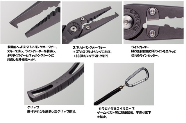 PEラインもスパッ!と切れるラインカッターやスプリットリングオープナーを一体化した多機能ヘッド形状、握りやすいグリップ形状、携帯に便利なカラビナ&スパイラルロープ等、様々なフィッシングシーンで必要とされるマルチな機能はそのままに、先端部を細長くすることで、より細かな作業や奥まった箇所へのアプローチを容易にしたロングノーズプライヤー、それが「GMプライヤータイプ3ロングノーズ」です