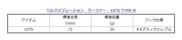 ・リヤフックハンガーを後端にセット、フォール時に針が片側に寄らないので安定し、フォール姿勢を確保。トーナメントを想定して計算し尽くされたボディ。107Sは#2の大型フックも搭載可能。(標準装備は前後#4フック)
